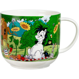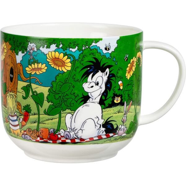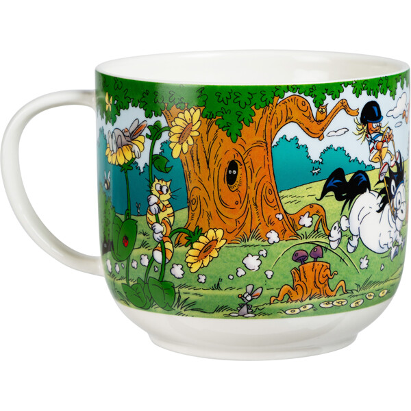 En stor, blødt afrundet temugge i hvid keramik med et glat Hästen Mulle-motiv af Lena Furberg.