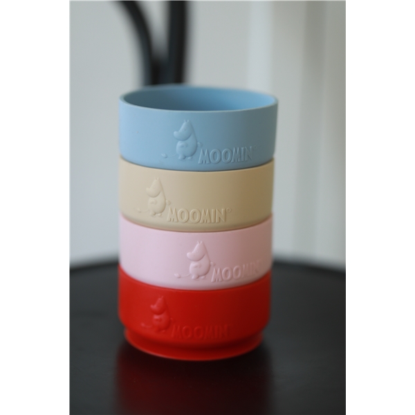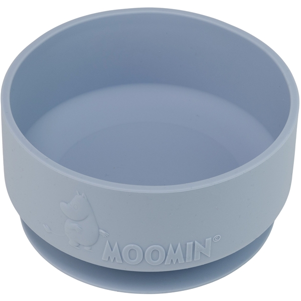 En praktisk skål i silikone med et legesygt Mumi-motiv. Skålen har en smart sugekop på undersiden, der sikrer at den sidder fast på bordpladen, hvilket letter processen når barnet skal lære at spise selv.