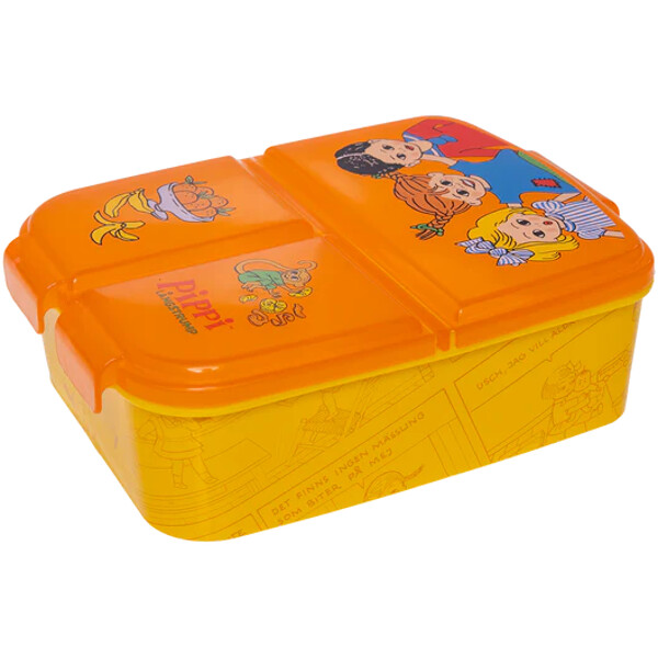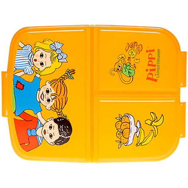 En fin madkasse med Pippi og hendes venner. Madkassen er lavet af plast og har tre forskellige rum, der nemt lukkes med låse på siderne. Perfekt til at pakke mad og lækkerier til bilturen eller skolen. Fri for BPA.