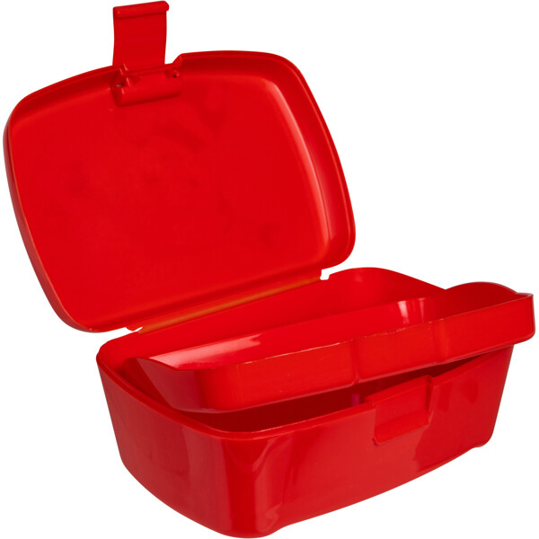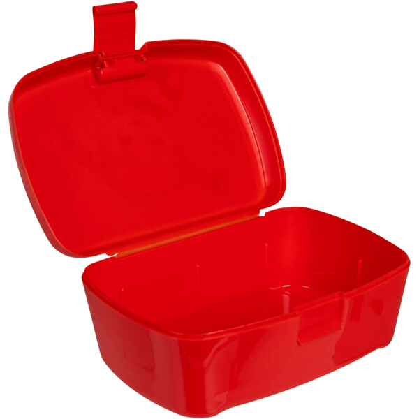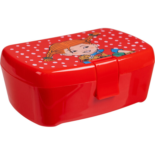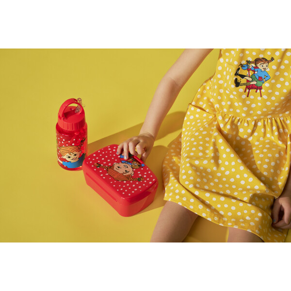 Rød madkasse i BPA-fri PP-plast, med hængslet låg med spænde. Det prikkede låg har et fint motiv af Pippi Langstrømpe og Hr. Nilsson. Inde i kassen er der en aftagelig skillevæg, som er praktisk at bruge til at lægge sandwichen i den nederste del og bær eller nødder i den øverste.