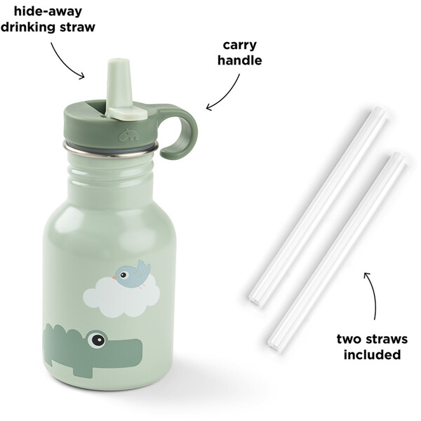 Metalflasken er robust og har et praktisk sugerør, der kan foldes ned. Den er perfekt til børnenes rygsæk eller derhjemme. Flasken leveres med to sugerør.