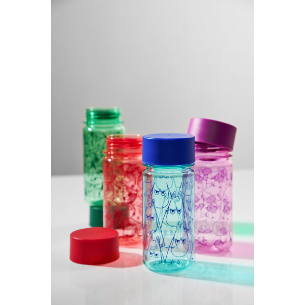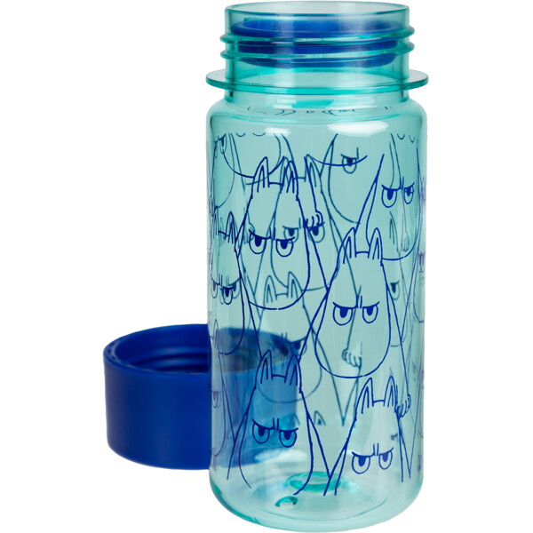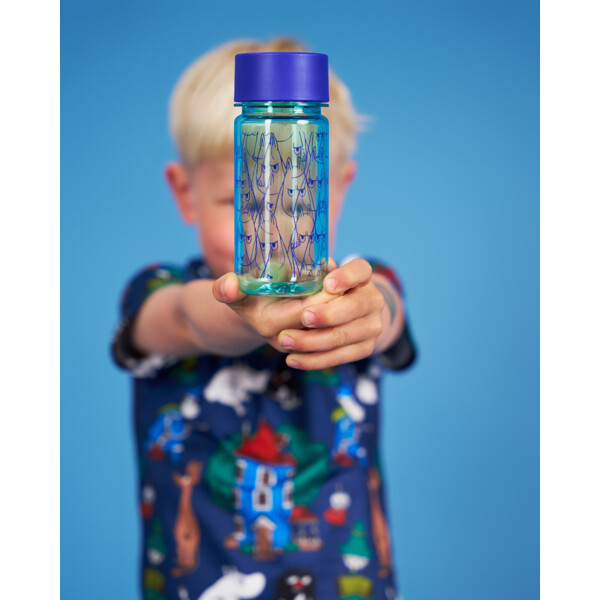 En praktisk 3 dl vandflaske med sjovt men arrigt Mumitrold-tryk. Den blå flaske er gennemsigtig og fremstillet i BPA-fri tritanplast. Under skruelåget har den et aftageligt mellemlæg, der gør det lettere at drikke mindre slurke, selv for yngre børn.