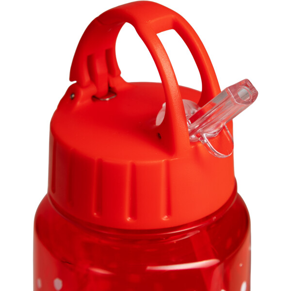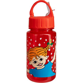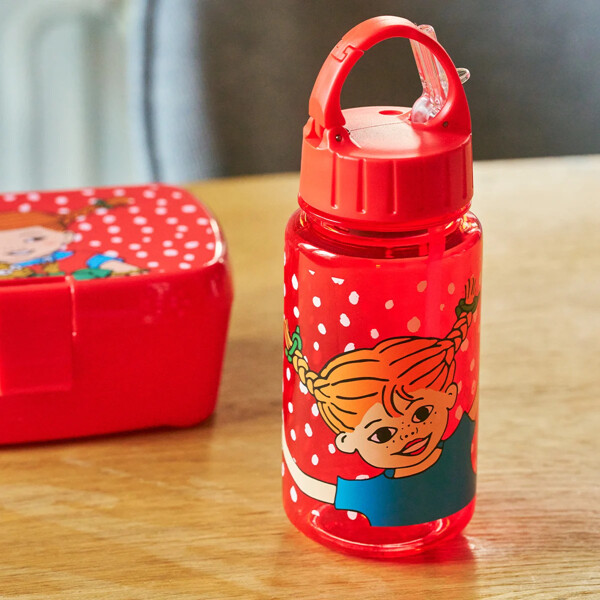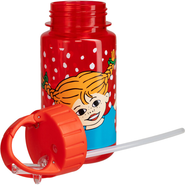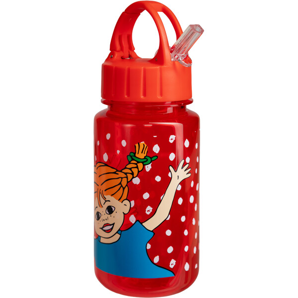 En rød vandflaske med sugerør i børnestørrelse. Flasken er prikket, med sjovt motiv af Pippi Langstrømpe og Hr. Nilsson.