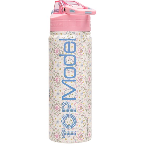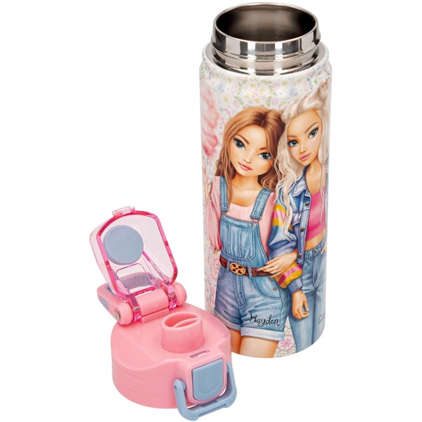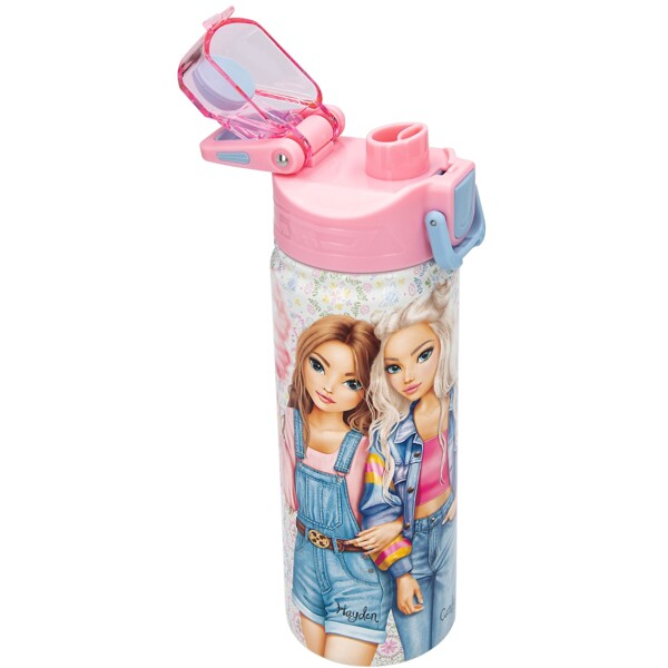 En flot drikkeflaske fra TOPModel FESTIVAL FUN-serien med et bedårende blomstermønster rundt om, et stort motiv af TOPModellerne Hayden og Candy samt smukke lyserøde og blå detaljer.
