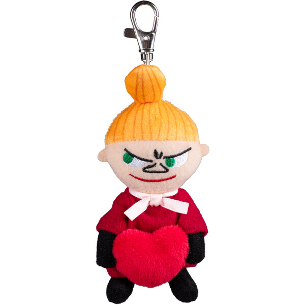 En taskedekoration eller plysdyr-nøglering fra Mumi, med Lille My som holder en lille hjertepude i favnen.