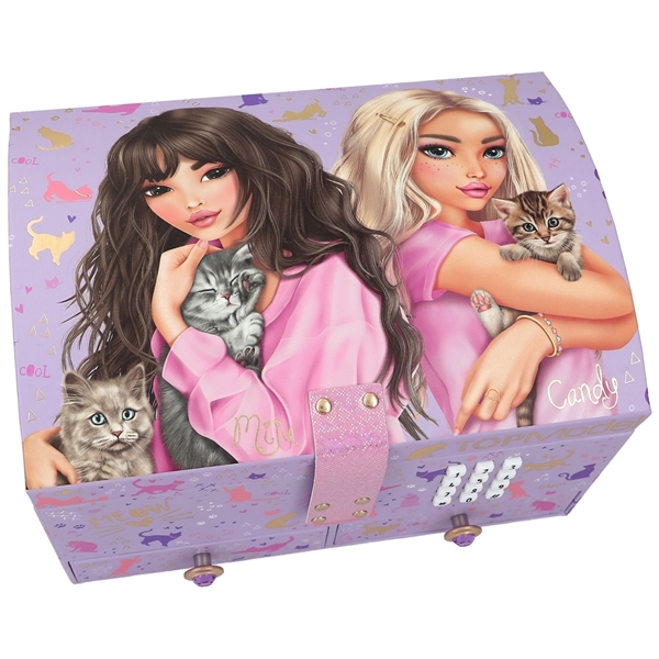 Gem dine små skatte i dette lilla og rosa smykkeskrin i et supersødt TOPModel-design med katte på. Smykkeskrinet har to skuffer og et stort inderrum med en aftagelig bakke til alle dine dyrebare smykker. Smykkeskrinet er desuden udrustet med en sikker kodelås, som du selv kan vælge. Når den rigtige kode indtastes, afspilles melodien "Shivers", hvilket er mega cool men også fungerer som en ekstra sikkerhedsforanstaltning for at afsløre eventuelle "spioner".