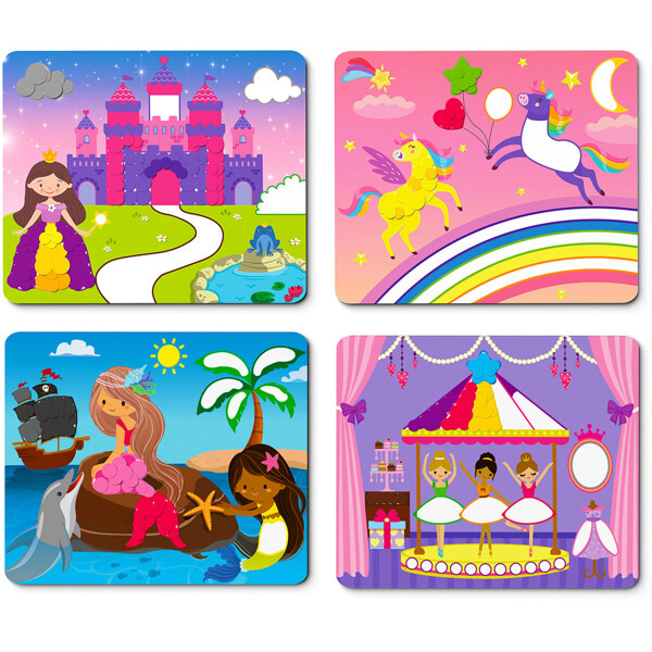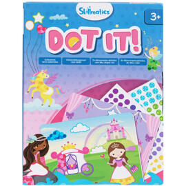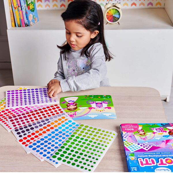 Med over 500 runde klistermærker i forskellige størrelser og farver kan barnet bruge sin fantasi til at farvelægge de medfølgende billedkort. Temaet er magiske enhjørninger og prinsesser. Udvikler finmotorik, pincetgreb, kreativ og rumlig tænkning, øje-hånd koordination og koncentration.