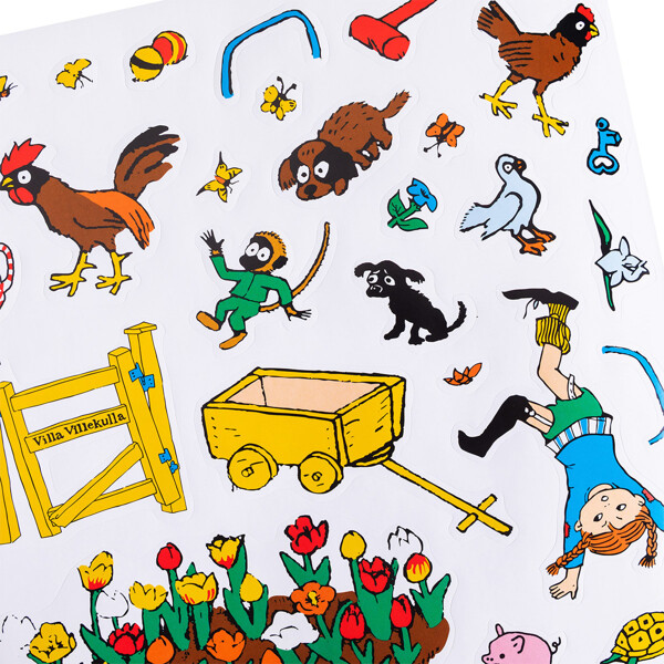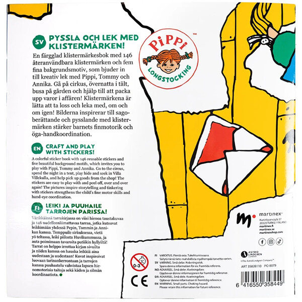 En farverig klistermærkebog med 146 genanvendelige klistermærker og fem flotte baggrundsmotiver, der inviterer til kreativ leg med Pippi, Tommy og Annika. Gå i cirkus, overnat i telt, lav sjov på gården og hjælp med at pakke varer ud i butikken! Klistermærkerne er nemme at tage af og lege med, igen og igen! Billederne inspirerer til historiefortælling, og leg med klistermærker styrker barnets finmotorik og øje-hånd-koordination.