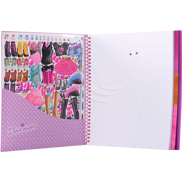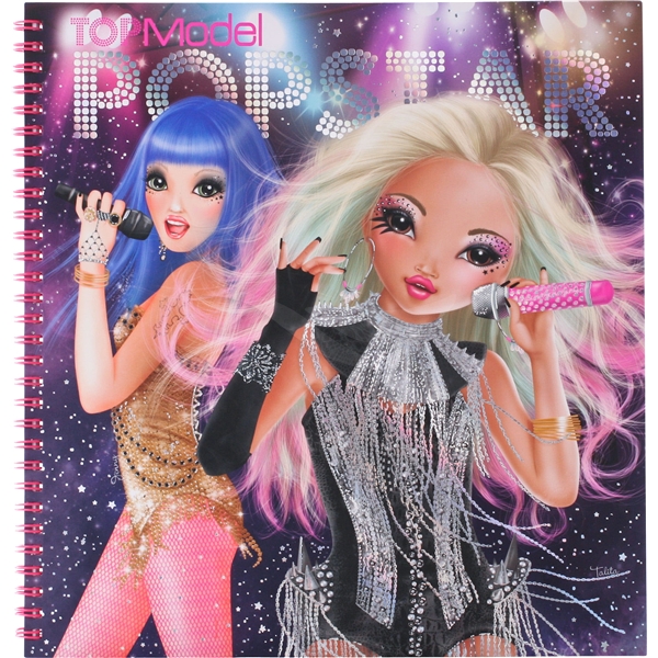 TOPModel Popstar Malebog er en super fin malebog hvor du kan designe tøj, hår og sminke til seje popstjerner!