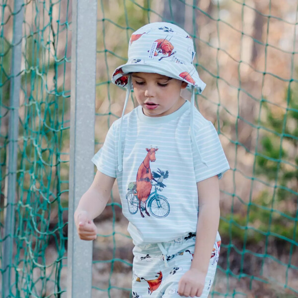 En solhat i blød, sval bomuld med Mamma Mu print. Solhatten har snore til at binde under hagen og elastik bagpå for den bedste pasform.
