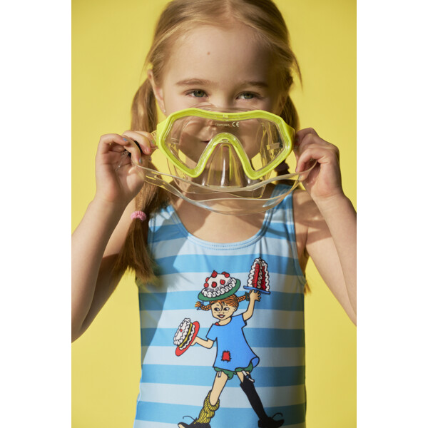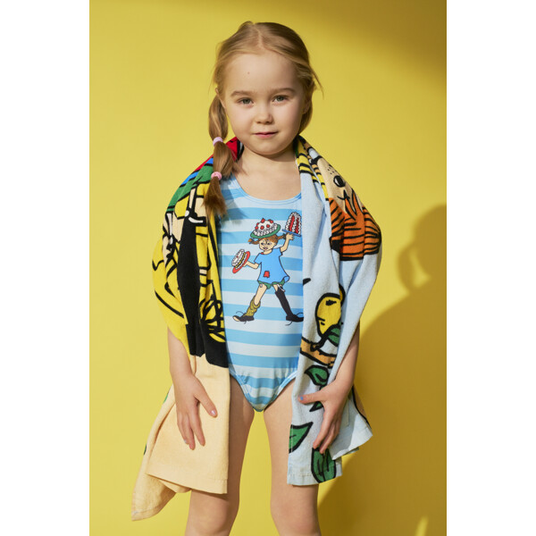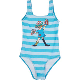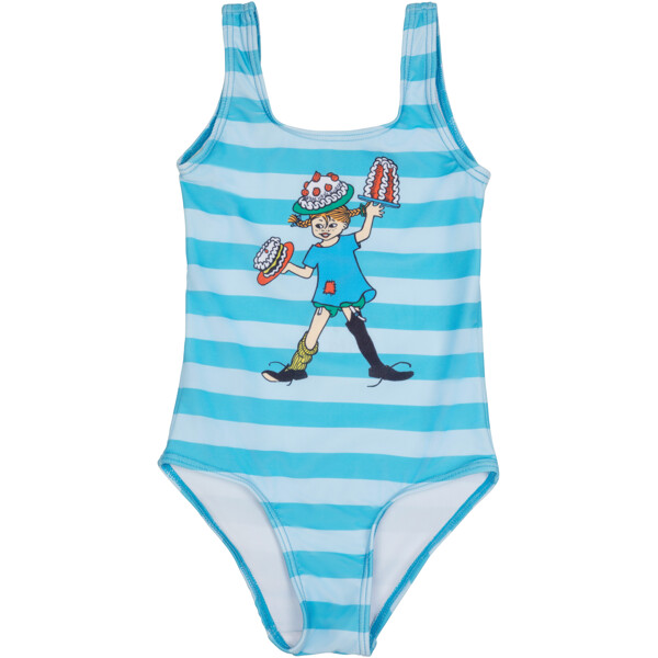 En fin Pippi badedragt til børn. Badedragten er foret foran, høj i ryggen med brede og solide skulderstropper. Fremstillet af elastisk, hurtigtørrende polyesterblanding.