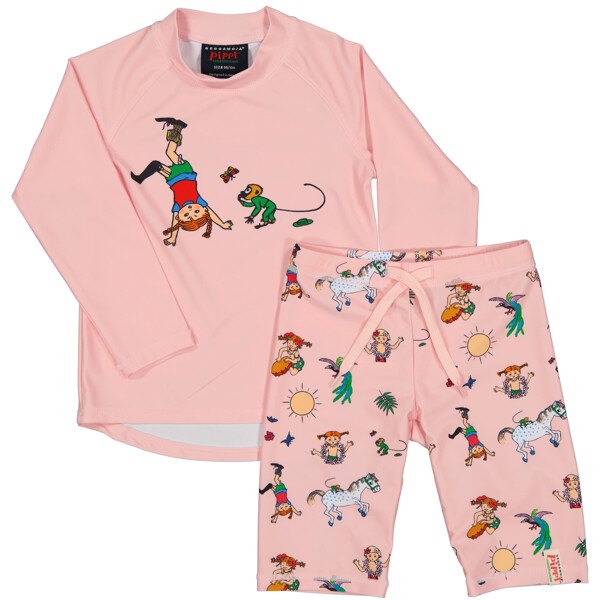 UV-sæt med Pippi-motiv fra Geggamoja. Trøje med lange ærmer og bukser med korte ben. Bukserne har elastik i taljen.
