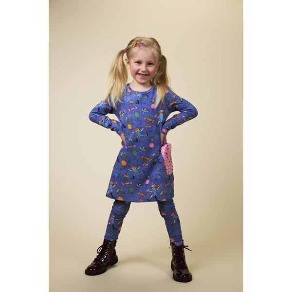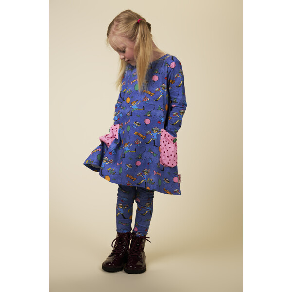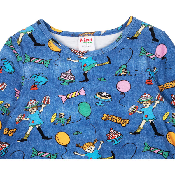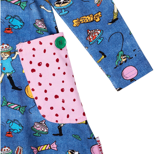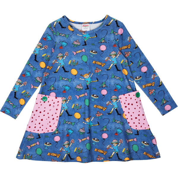 En blød og skøn Pippi Langstrømpe-kjole til børn, i herlig denimblå med festligt mønster. Den A-formede kjole har lange ærmer, en rund halsudskæring og påsyede lommer med dekorationsknapper i skørtet. Produktet indeholder certificeret økologisk bomuld.