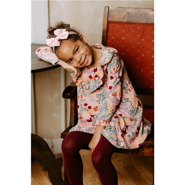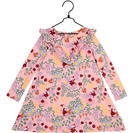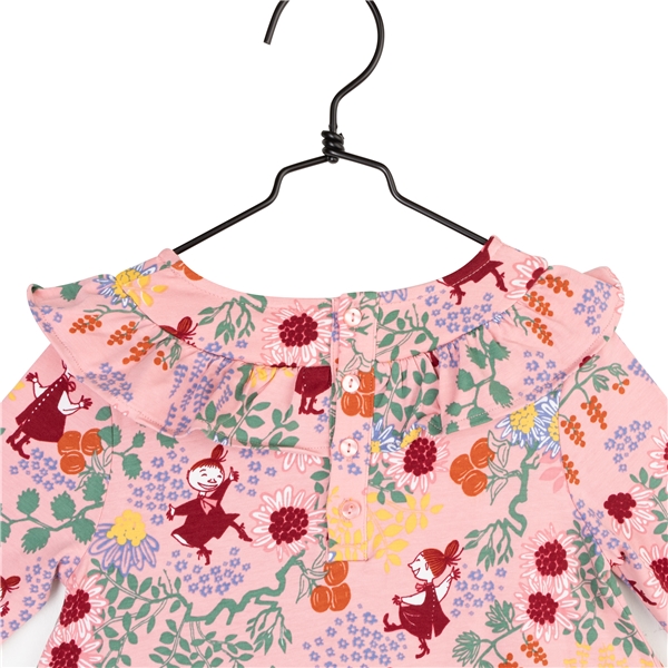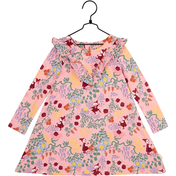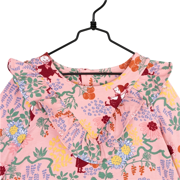 Mumi Mimosa Kjole Lyserød er en langærmet kjole i en sart lyserød farve i en bred model. Kjolen er helmønstret med motiv af en dansende Mymlen blandt smukke blomster. Fortil, over skuldrene og ned over ryggen er der påsyet en fin flæsekant, som sammen med de perlemorsskinnende knapper i ryggen giver kjolen et festligt look.