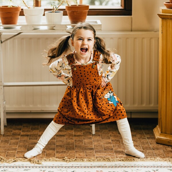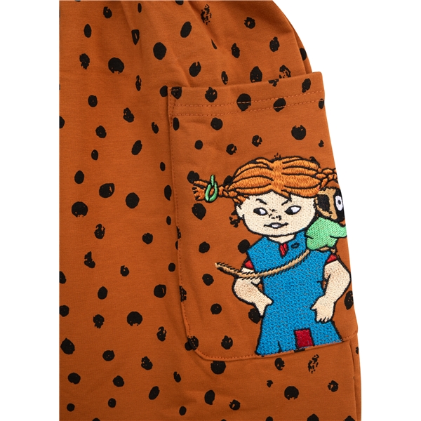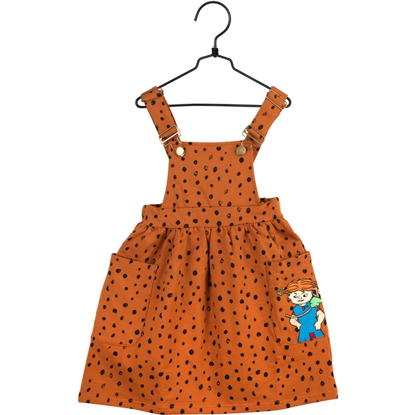 En blød og skøn selekjole i sweatshirtkvalitet med en børstet inderside. Kjolen er sortprikket og har påsyede lommer fortil. Den ene lomme prydes af et Pippi Langstrømpe-broderi. Taljen er elastisk og de justerbare seler krydses over ryggen, hvilket gør at de holdes perfekt på plads.