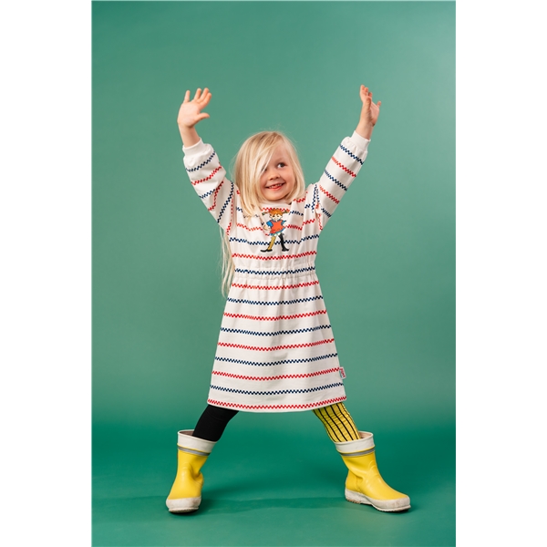 En blød og hyggelig Pippi Langstrømpe collegekjole til børn. Langærmet med let nedfaldende skuldersøm, manchetter ved ærmeenderne, rund halsudskæring, fine røde og blå striber mod det benhvide, samt et farverigt Pippi-tryk foran. Kjolen er skåret med indsat elastik og rynk i taljen. Produktet indeholder certificeret økologisk bomuld.