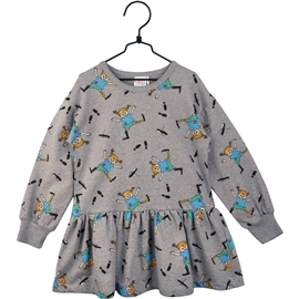 Pippi Trin Collegekjole Grå er en fin, grå kjole med lange ærmer, en rund halsudskæring og flæsekant forneden. Kjolen er pyntet med tryk af glade Pippi-figurer samt hendes sko og fodaftryk.