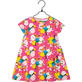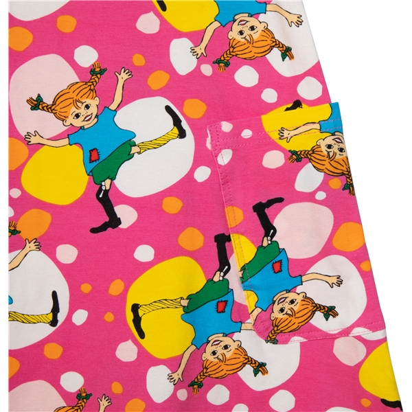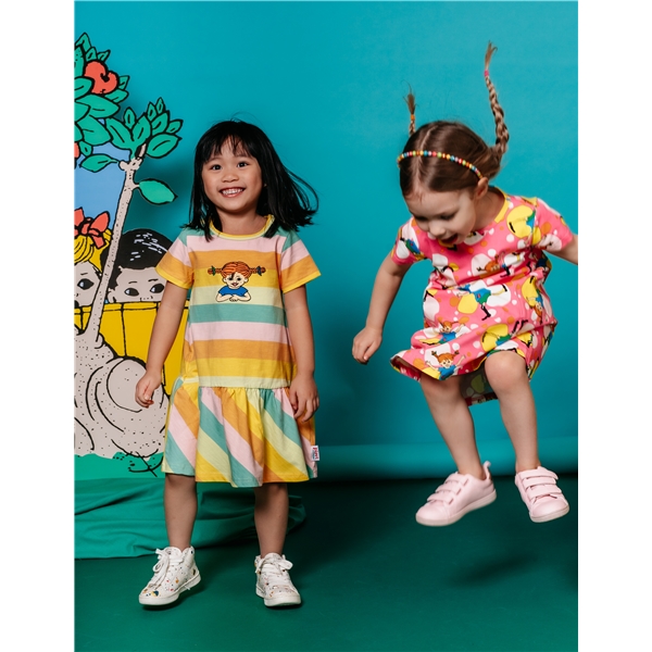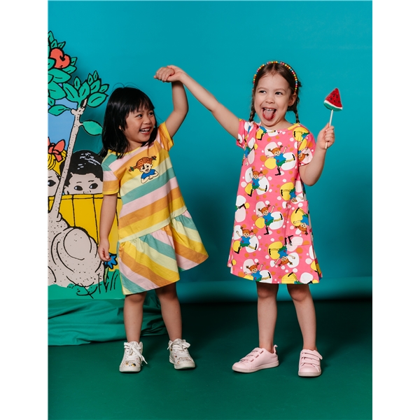 En farverig Pippi-sommerkjole til børn. Kjolen har en A-form med korte ærmer og to påsyede lommer på den nederste del. Kjolen er fremstillet af en GOTS-certificeret økologisk bomuldsblanding.