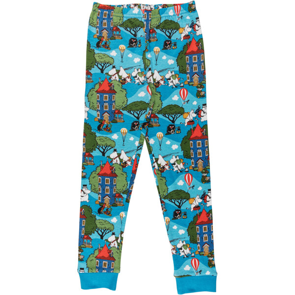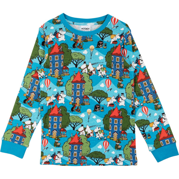 Et todelt Mumi pyjamas til børn. Med lange ærmer og rund halsudskæring. Bukserne har indsat elastik i taljen og ribkant ved benafslutningen. Fremstillet i blød og hyggelig bomuld.