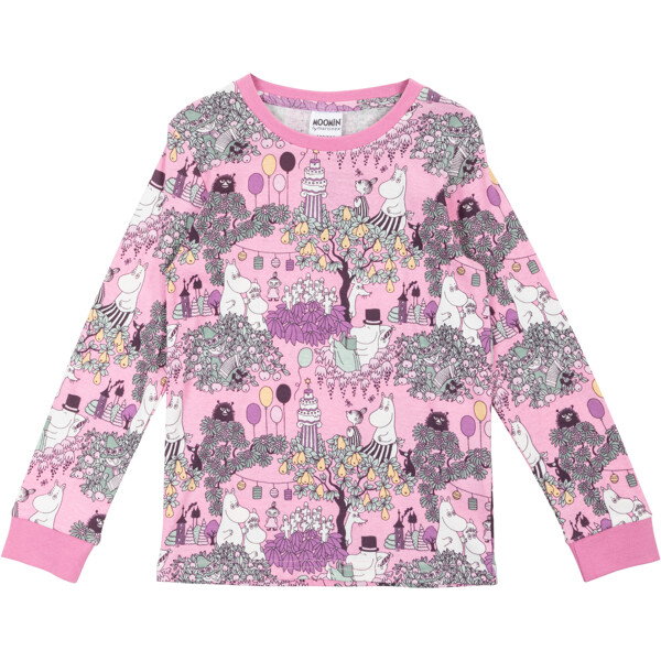 Et todelt Mumi pyjamas til børn. Med lange ærmer og rund halsudskæring. Bukserne har indsat elastik i taljen og ribkant ved benafslutningen. Fremstillet i blød og hyggelig bomuld.