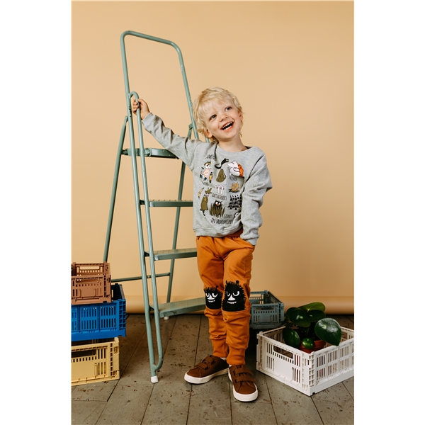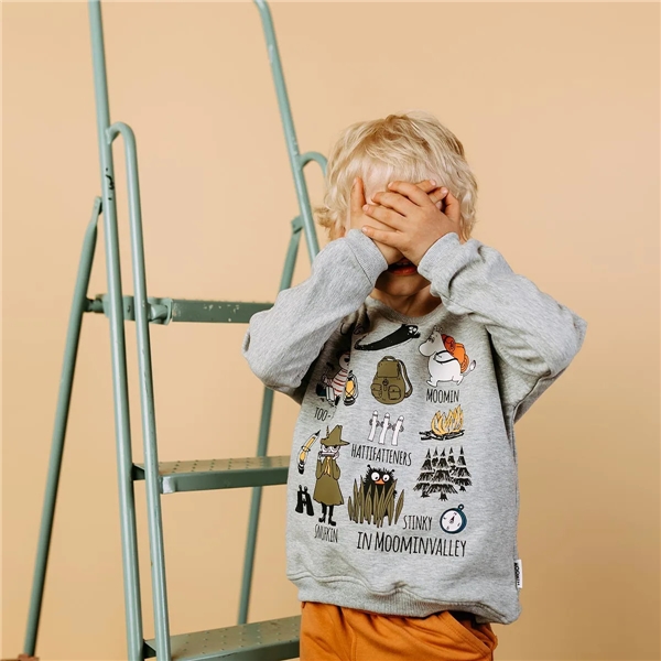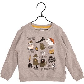 Mumi Collegebluse Grå er en blød og praktisk Mumi-bluse i oversize-størrelse. Blusen har en rund halsudskæring og et trykt mønster med forskellige Mumi-figurer i et campingtema.