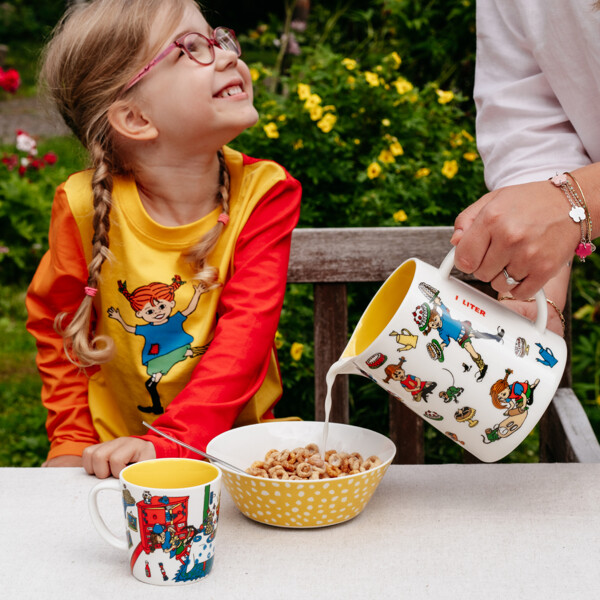 Glade Pippi Bluse Gul er en farverig og legesyg Pippi-bluse med lange ærmer og en rund halsudskæring. Blusen er orange, rød og gul og har et Pippi-tryk på forsiden.
