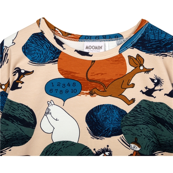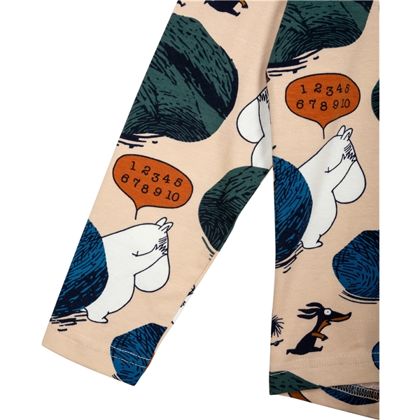 En langærmet helmønstret bluse i beige med motiv af Mumi-figurer, som leger gemmeleg og tæller til 10 blandt de store sten. Modellen er let oversized med sænket skuldersøm og en fint afrundet kant forneden.