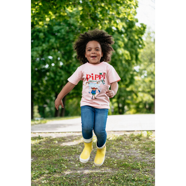 Rosa t-shirt i lige model med rund halsudskæring og kort ærme, fremstillet i 100% bomuld. Foran et stort Pippi Langstrømpe-tryk med billede og store bogstaver.