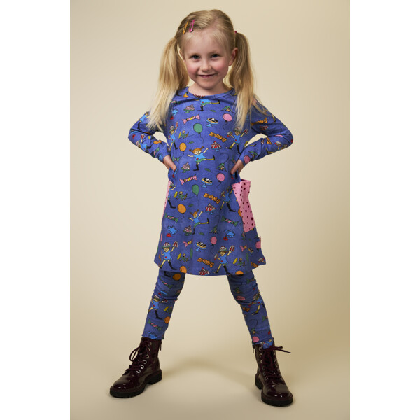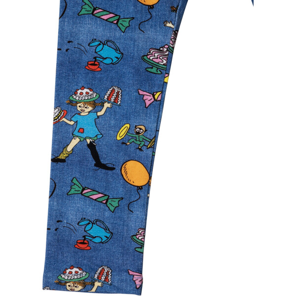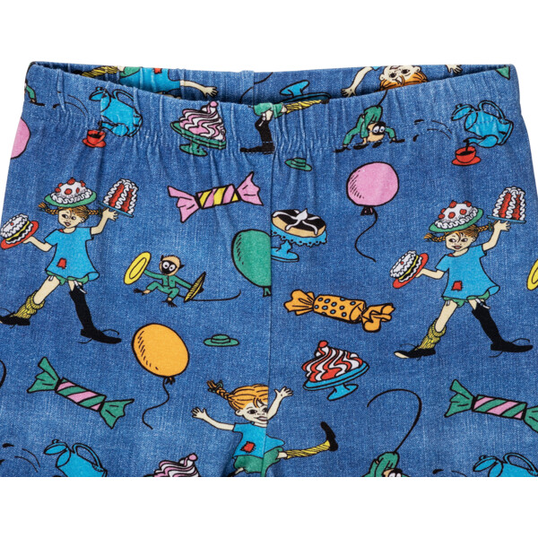 Bløde og behagelige Pippi Langstrømpe-leggings til børn, med indsyet elastik i taljen. Leggingsene er herligt denimblå med festligt mønster. Produktet indeholder certificeret økologisk bomuld.