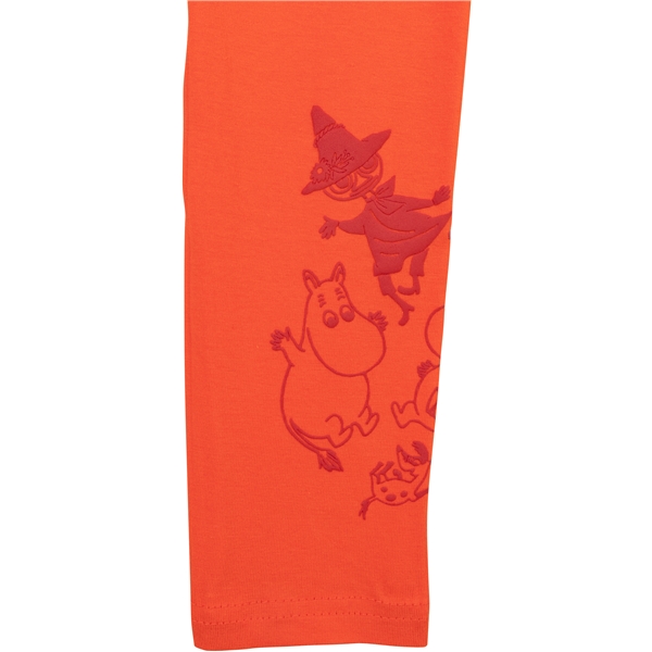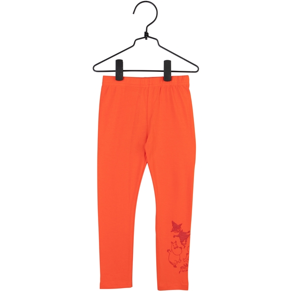 Skønne knaldrøde leggings med indsyet elastik i taljen. Længst nede på det venstre ben ses et let hævet gummitryk af Mumitrolden, Snorkfrøken, Lille My og Mumrik i en mørkere rød farve.