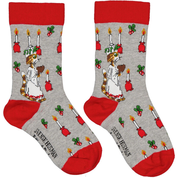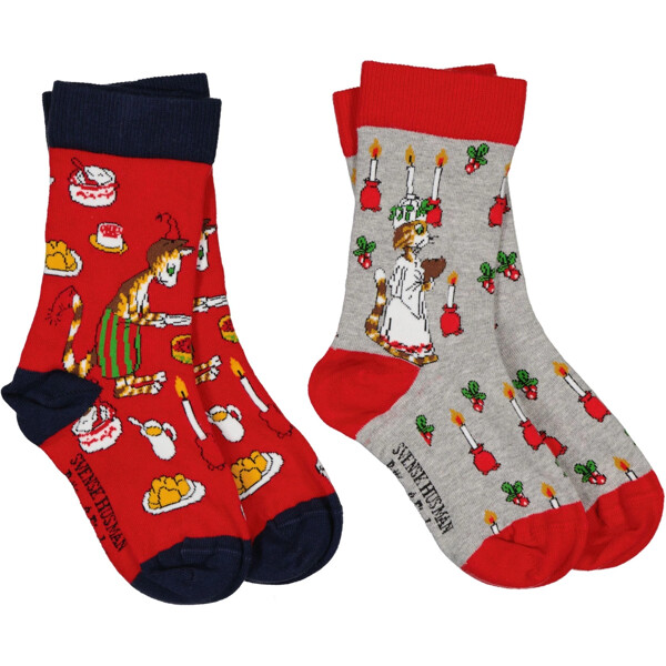 Gør ventetiden til juleaften lidt sjovere med disse farverige børnestrømper med motiver fra elskede Peddersen og Findus! I dette 2-pak får du to forskellige mønstre – et med Findus, der spiser en masse julemad, og et med Findus som lucia.Bevarer farve og form selv efter mange eventyr i vaskemaskinen.