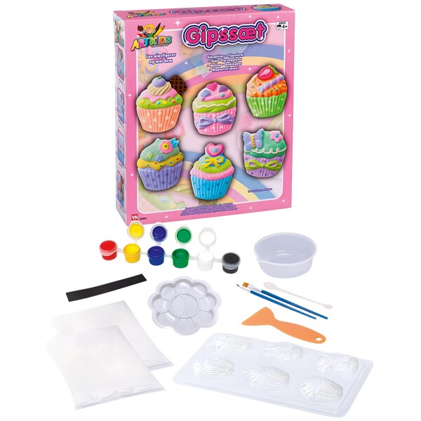 Et hobby-sæt, hvor du skal støbe muffinsfigurer i gips og derefter dekorere dem med seje farver. Fastgør en magnetstrimmel bagpå og sæt dit kunstværk op på køleskabet.