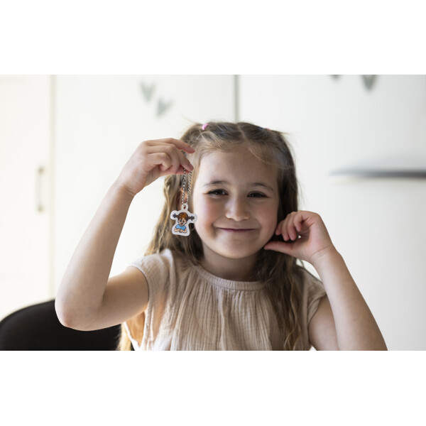 Farvelæg, klip og se figurerne krympe i ovnen, de bliver hårde og holdbare, perfekte som nøgleringe eller dekoration til børnetasken.