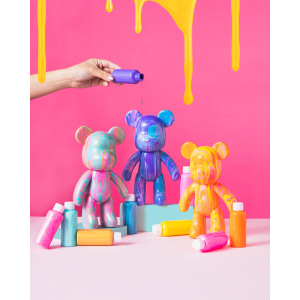 Pour Palz-bjørnen mangler farve. Bland farven som du vil, hæld den over figuren og lad den tørre. Du får en helt unik samlerfigur, der ikke ligner nogen anden!