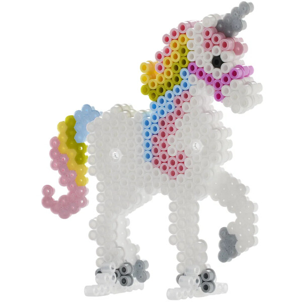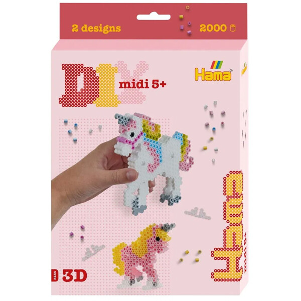 Hama Midi Box Unicorns 2000 stk er et sæt med cirka 2000 perler, 1 stor sekskantet perleplade (nr. 276), 4 perlestøtter, 1 HamaGem, motivmønster, vejledning og strygepapir.