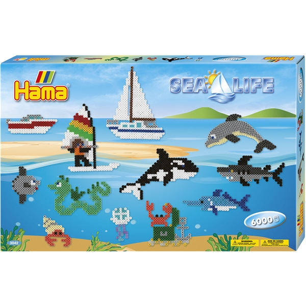 Hama Midi Giant Gaveæske Sealife 6000 stk. - Et stort perlesæt med over 6000 perler, 3 perleplader, designskabelon, brugsanvisning og strygepapir som gør at du kan skabe op til 12 stk. forskellige motiver fra havet. En værdsat gave og en sjov beskæftigelse som kan underholde i timevis.