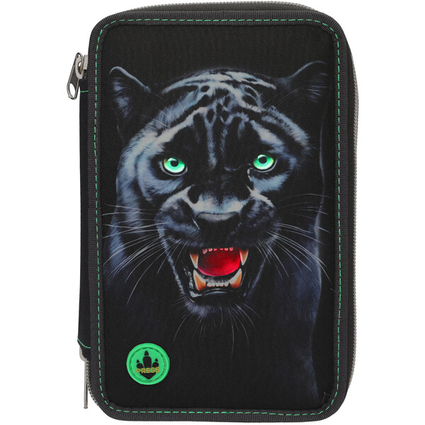 Sejt penalhus fra Adventure World PANTHER-serien i mørkegrå med grønne detaljer og et stort motiv af en sort panter på forsiden, hvis øjne og mund lyser op i ca. 15 sekunder, når man trykker på knappen.