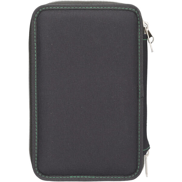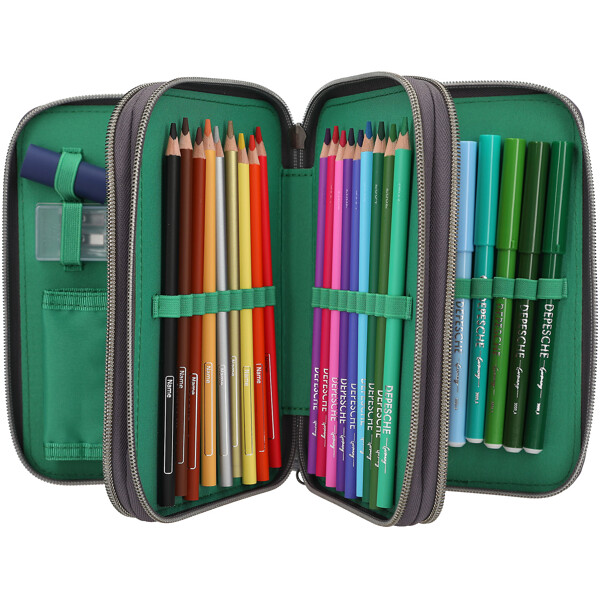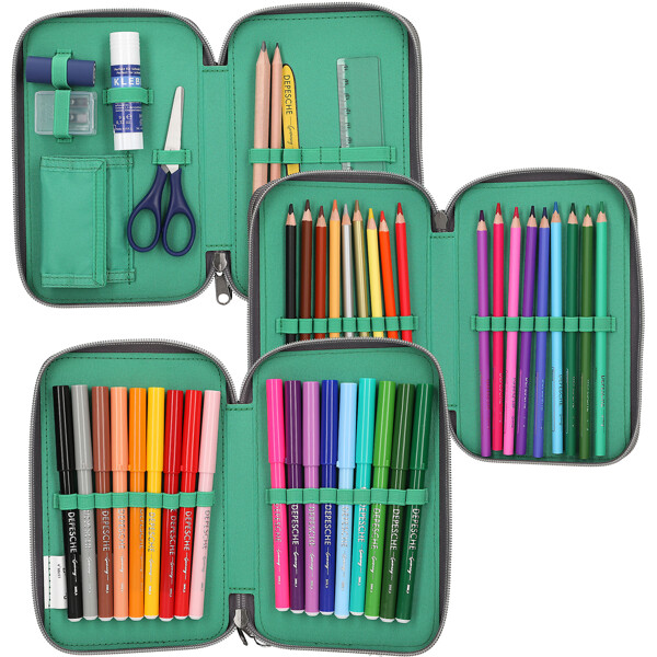 De tre separate rum er komplet fyldt med alt, hvad der er nødvendigt for at tegne, skrive og lave hobbyarbejde: hver 18 farve- og tuschpenne, 2 blyanter, blyantspidser, viskelæder, lineal, saks, limstift samt en lille velcrolomme.