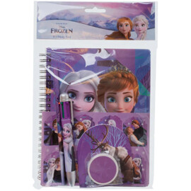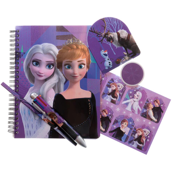 Disney Frozen Skrivesæt med A5 spiral notesbog med 60 linjerede sider (blød omslag på A5 notesbog 350gsm) flerfarvet pen, klistermærke, blyant, viskelæder og lille notesblok med 40 sider.
