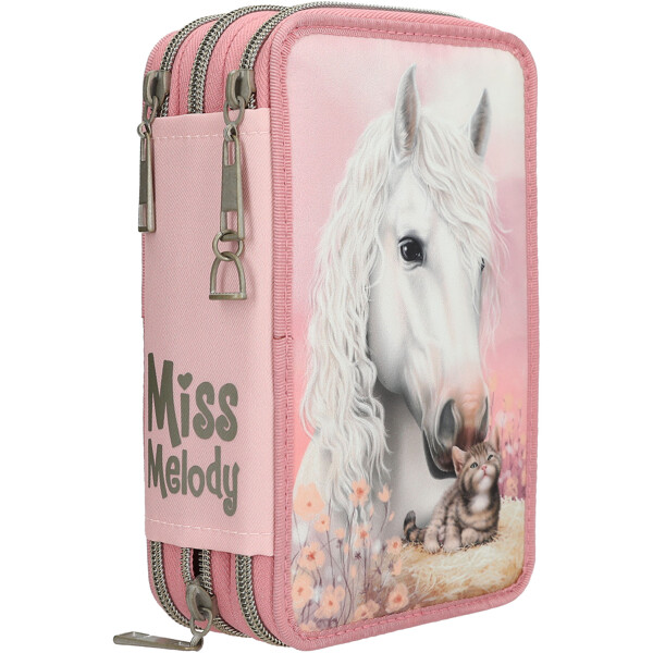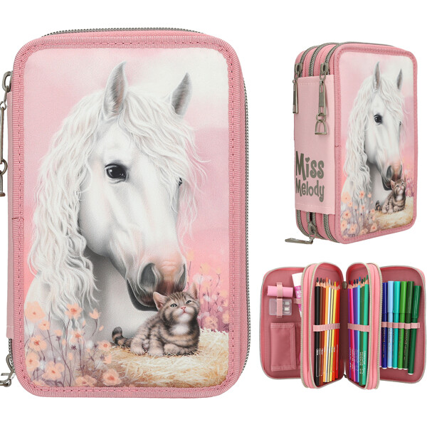 Dette fine penalhus i lyserød fra Miss Melody TRUE FRIENDS-serien har et stort motiv af en hvid hest og en lille killing på en høballe omgivet af smukke blomster.
