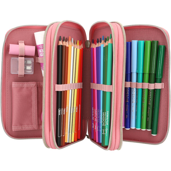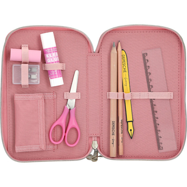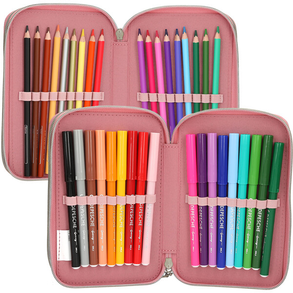 De tre separate rum er komplet fyldt med alt, hvad der behøves for at tegne, skrive og lave hobbyarbejde: hver 18 farve- og tuschpenne, 2 blyanter, blyantspidser, viskelæder, lineal, saks, limstift samt en lille velcrolomme.