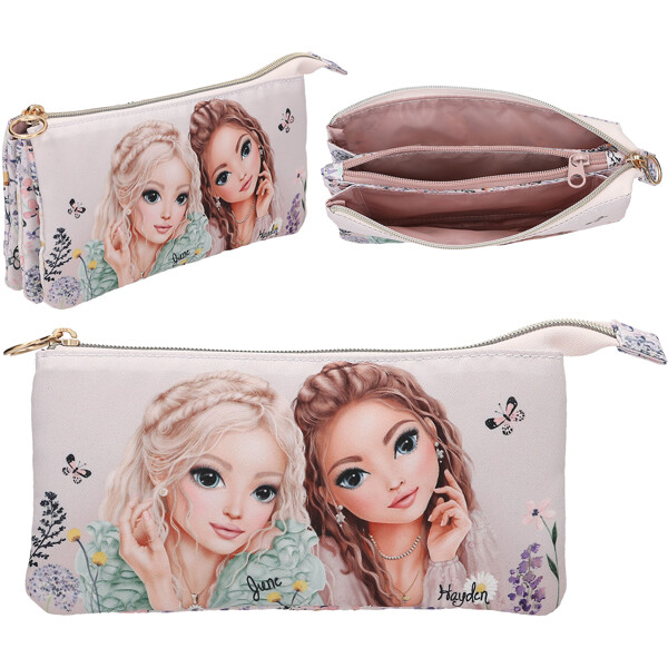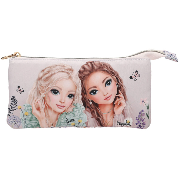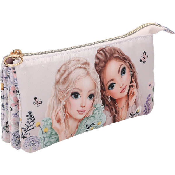 Praktisk penalhus fra TOPModel-serien SUMMER FEELING med et romantisk modelmotiv på forsiden og et fint mønster af blomster og sommerfugle på bagsiden. Med to lynlåse og hele tre rum til at opbevare blyanter, makeup eller andre småting.