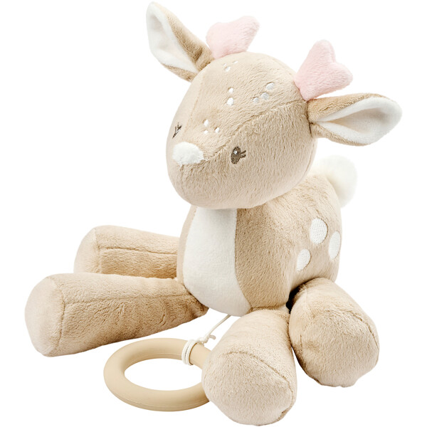 Denne søde musiklegetøj fra Nattou i form af en hjort giver ro og tryghed til børneværelset. Ved forsigtigt at trække i silikoneringen lyder den velkendte melodi "La-Le-Lu", som hjælper dit barn med at slappe af og falde i søvn roligt. Den ekstremt bløde velour og det venlige design indbyder til kram og opdagelser. Takket være de praktiske snore kan du nemt fastgøre musikudløseren på tremmesengen, barnevognen eller autostolen. En fortryllende kombination af legekammerat og tæppe, og en vidunderlig babygave, der gør både forældre og børn glade.Produktspecifikationer:Musikalsk legetøj i form af en hjortSpiller en beroligende "La-Le-Lu"-melodiEkstremt blødt bamsetøj, perfekt til kramSilikonering for nem aktivering af spilledåsenHar snore til at fastgøre i tremmeseng, barnevogn eller autostolMål: 18 x 17 x 28 cmPleje: håndvask, må ikke iblødsættesFanFan-kollektionen fra Nattou bringer et strejf af magi til dit barns verden, med søde elefanter og hjorte som bløde følgesvende.