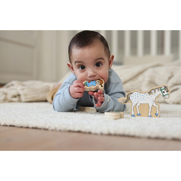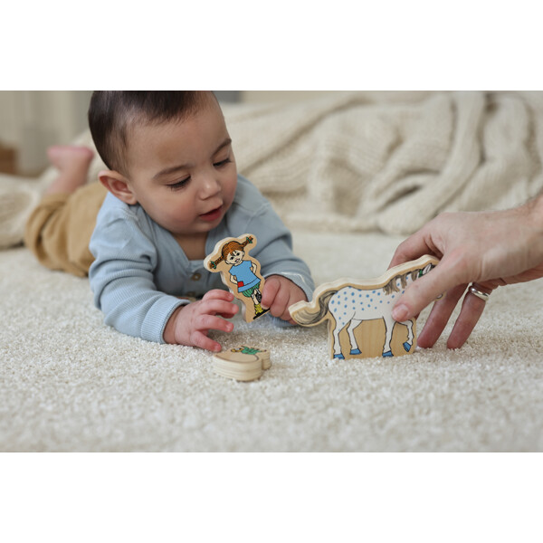 Med fem træfigurer Pippi, Tommy, Annika, Lille Gubben og Hr. Nilsson kan barnet skabe egne små eventyr. Figurerne er nemme at gribe og kan tages med overalt. Perfekte til små børn, der lige er begyndt at lege med karakterer og finde på egne historier.
