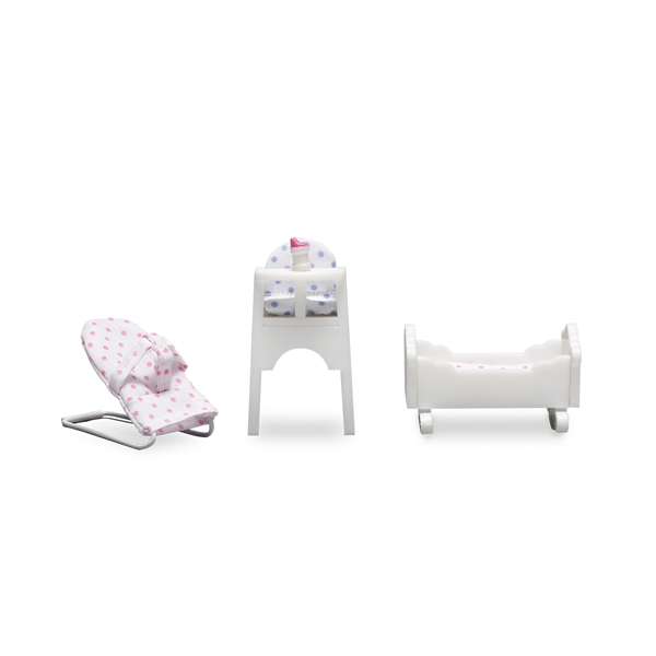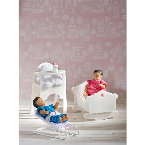 Midlertidigt udsolgt fra leverandøren. Tilgængelig igen fra uge 17.Lundbys dukkehuse er vidunderligt klassisk legetøj der har været en del af de svenske hjem siden 1947, og som har givet svenske børn mange timers glæde og sjov leg!Husene kendetegnes af et stort udvalg af møbler og tilbehør, og firmaet bag husene har placeret al design og produktudvikling i Sverige. Nu følger Lundby med tidens udvikling indenfor mode, form og design, og deres dukkehuse er tidstypiske eksempler på hvordan nutidens familier vælger at bo! Lundbys dukkehuse indgyder en nostalgisk følelse hos mange, og mange svenskere kan huske dem fra SVT’‘s julekalender fra 1980, ”Det bliver jul på Möllegården"!Om produktet:Vippestol, barnestol med pude og flaske samt vugge til familiens babyer.Mål: størrelsesforhold 1:18.