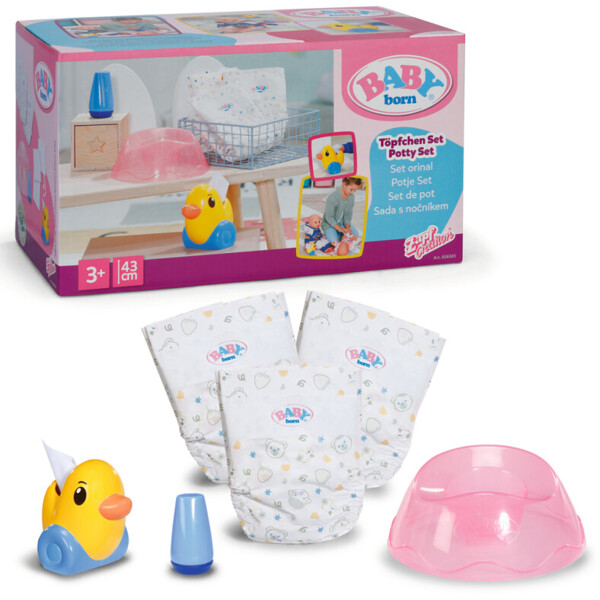 Indeholder: - BABY born pottesæt med potte, 2 bleer, cremebøtte, papirdispenser.