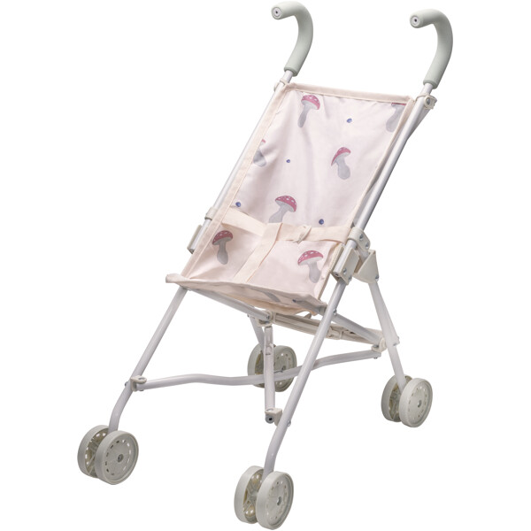 Denne klapvogn er et legende dukketilbehør, der passer til dukker i forskellige størrelser. Vognen er nem at tage med takket være sit bløde håndtag, den sammenklappelige ramme og det aftagelige betræk. Det lyserøde betræk er prydet med håndtegnede illustrationer af blåbær og svampe - et unikt design skabt i Sverige. Spænd det lille sikkerhedsbælte, så dukken sidder sikkert inden gåturen!