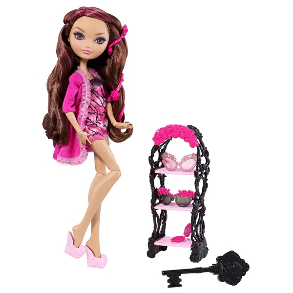 Sættet indeholder en Briar Beauty-dukke i en sød pyjamas med matchende morgenkåbe og morgentøfler, en reol med to par solbriller, et lommespejl og en nøgle. Fra 6 år.