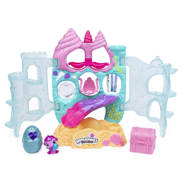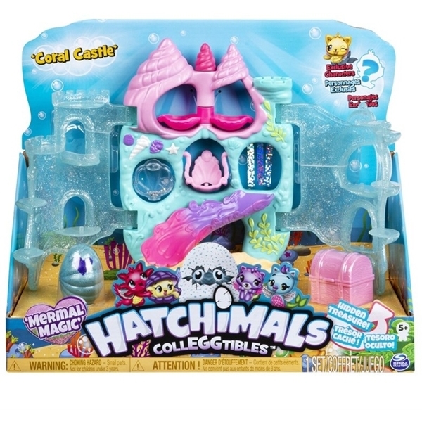 Med Hatchimals CollEGGtibles Coral Castle kan dine Hatchimals flytte ned under vandet i det smukke koralslot. Slottet har fine glitrende detaljer og de glitrende sider kan foldes ind. Lad dine Hatchinmals prøve rutsjebanen, dreje rundt, gynge, klatre og have det sjovt i koralslottet. Sættet indeholder et æg som skal klækkes, og i skattekisten er der en figur, der gemmer sig.