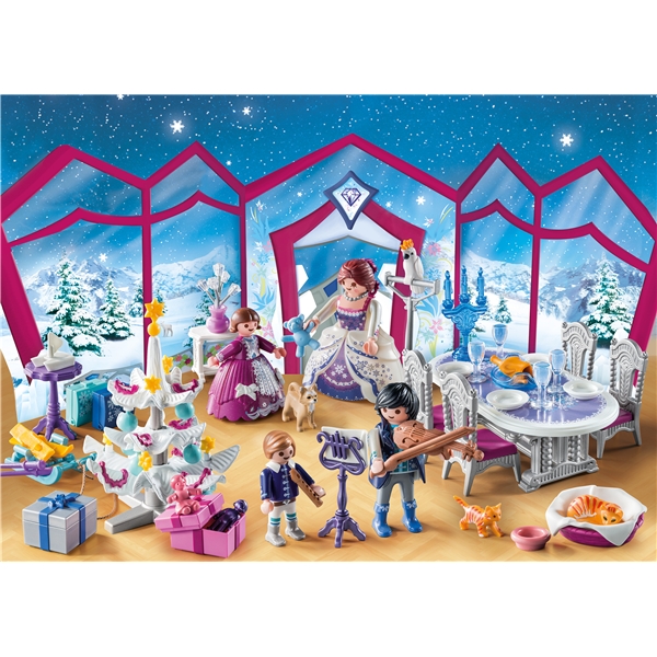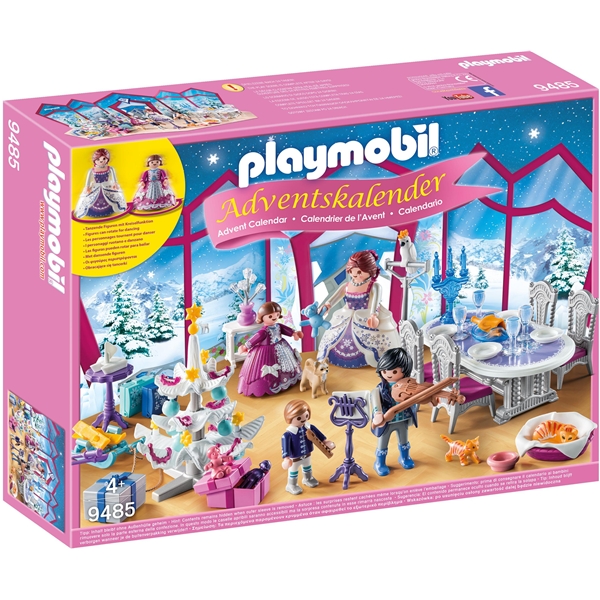 9485 Playmobil Julekalender ”Julebal i Krystalsalonen”- Familien fejrer jul i den glitrende krystalsal, der er pyntet op til jul. Efter en stor julemiddag spiller de musik og danser sammen. Alle glæder sig til at åbne gaverne. Med masser af tilbehør bag de 24 låger.